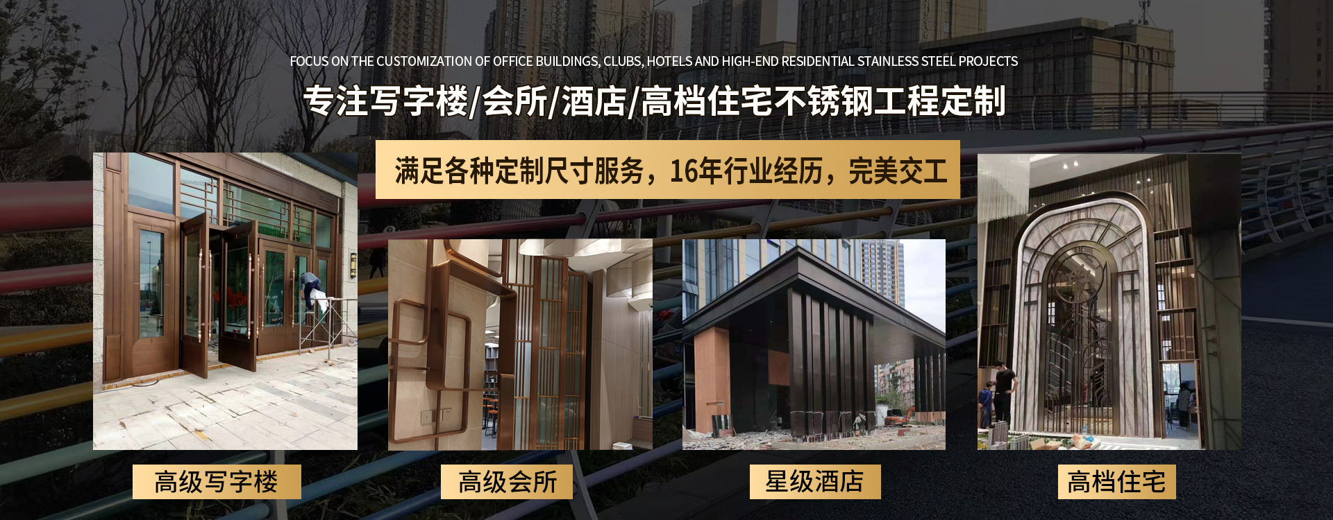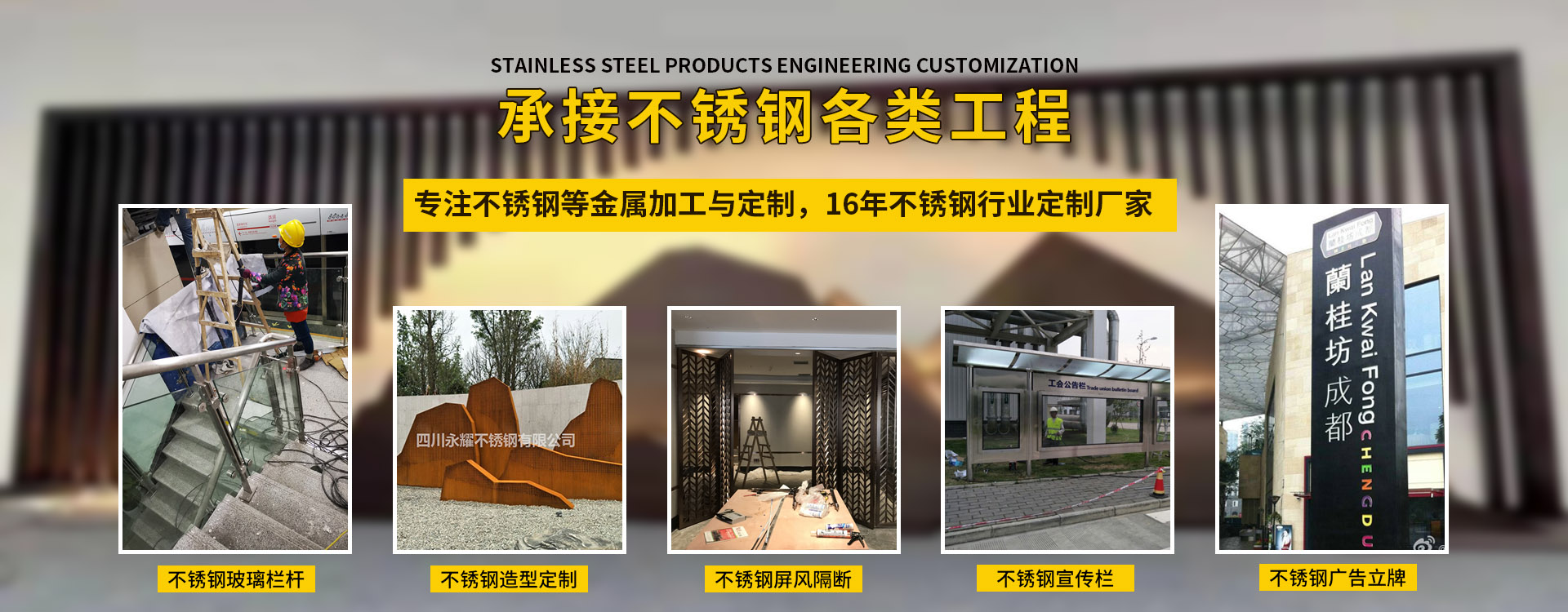四川永耀不銹鋼有限公司是一家集開發(fā)、設(shè)計(jì)、加工、制作、安裝、并承接各種不銹鋼工程為一體的綜合性企業(yè)。多年來一直在專注于不銹鋼等金屬的加工與研發(fā)。在客戶群體中贏得了良好的聲譽(yù),以專業(yè)專注的精神,致辭力于打造良好的產(chǎn)品和企業(yè)形象,對(duì)每一產(chǎn)品傾注全力,力爭每個(gè)細(xì)節(jié)精細(xì),確保產(chǎn)品具有優(yōu)越的性能,優(yōu)美的外觀及優(yōu)良的品質(zhì),使公司產(chǎn)品深受廣大用戶的親睞。 本公司主要業(yè)務(wù): 一、工程類 承攬:酒店、銀行、商鋪、寫字樓、公寓、城鐵、地鐵、公交、機(jī)關(guān)、 學(xué)校、廣場(chǎng)藝術(shù)雕塑、自動(dòng)門、旋轉(zhuǎn)門、廣告欄、公